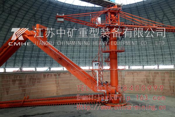 Decorate material by the center top material belt conveyor to cantilever pile machine, according to the "continuous" composite method of stacking. Girder at one end of the support on the center column, the other end of the support beam on beam cars. Scraper feeding mechanism is installed below the main girder, feeding way is take for full face. Material rake supports in girder on the side of the square, is expected to rake in the tower is located in the main girder. Is expected to rake drive hydraulic transmission. Reclaimer tensioning for hydraulic tensioning.