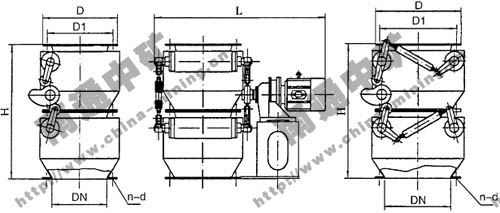 DN | D1 | D | H | H1 | L | n-d | 卸灰能力m3/h | 傳動(dòng)裝置型號(hào) | 開(kāi)閉頻率次/min | 功率kw |