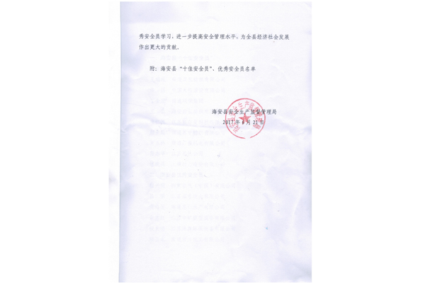 我司余志紅同志被表彰為海安縣優秀安全員