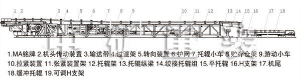 落地側(cè)裝式鋼架為機(jī)身,上托輥組間距為1 2或1 5米,下托輥組間距為3米。托輥組設(shè)有前后調(diào)整位置,通過調(diào)整托輥組位置來調(diào)整輸送帶的跑偏。托輥均采用沖壓軸承座托輥,設(shè)有雙重密封,具有重量輕、密封性能好、旋轉(zhuǎn)阻力小、使用壽命長等特點(diǎn)。