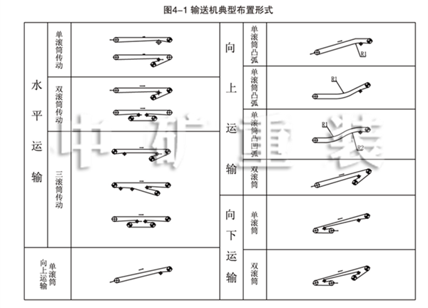 4-1、帶式輸送機可以用于水平或者傾斜輸送,可以傾斜向上,也可以傾斜向下,其典型布置形式參照圖4-1。